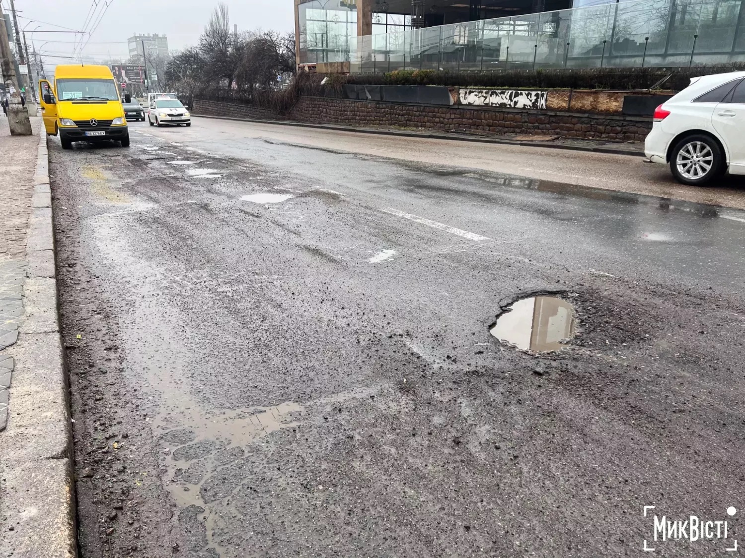 Стан дороги на Центральному проспекті у Миколаєві після того, як зійшов сніг. Фото: «МикВісті»